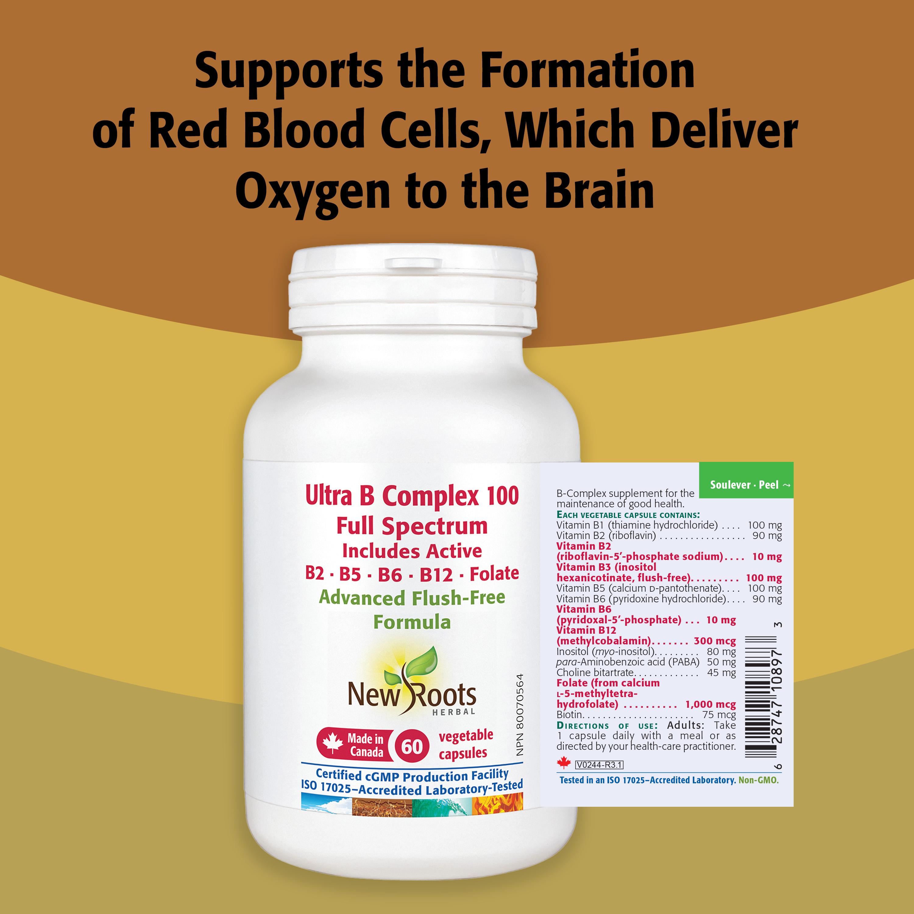 Advanced flush-free Ultra B Complex features biologically active B‑complex vitamins formulated with PABA and choline as complementary nutrients for nervous-system support.