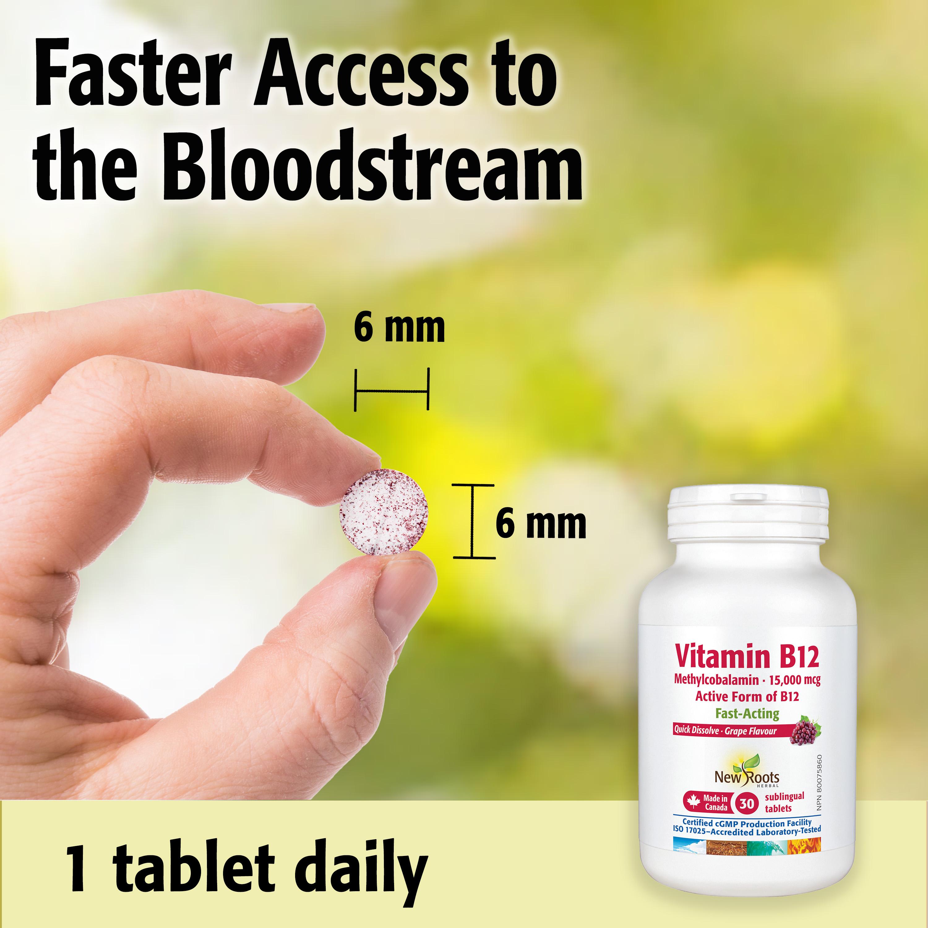 New Roots Herbal’s Vitamin B12 delivers a concentrated 15 mg dose of methylcobalamin, the biologically active form of vitamin B₁₂ that the body can readily utilize. The fast-dissolving sublingual tablet allows absorption through the highly vascular tissue beneath the tongue, helping facilitate efficient uptake by bypassing typical digestive processes. Vitamin B₁₂ helps maintain immune function, supports normal DNA synthesis, and is a factor in the formation of red blood cells. It also contributes to cellular energy metabolism by helping the body convert nutrients into usable energy.
